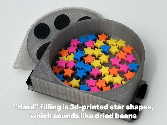 My hard filling is 3d-printed star shapes, which is a little louder and sounds more like a dried bean shaker.