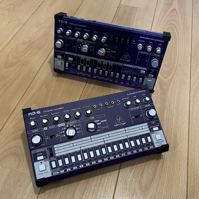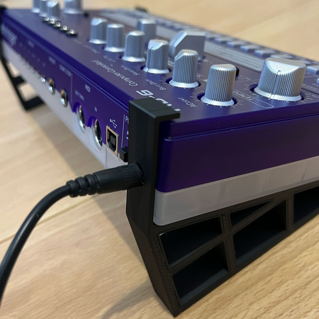 This is a 3D-printed stand of my own design, to hold a Behringer TD-3 bass synth or RD-6 drum machine at an improved working angle, or to help reduce the footprint on your desk.
